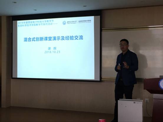 会上,谢晖老师以微生物学的一个知识点为例现场教学,展示课堂教学创新的理念、思路、方法与效果。演示结束后,谢晖老师针对传统课堂上存在的问题,分享了自己的教学经验和感悟—“学习培训,夯实教学基础;点滴积累,充实教学内容;潜心钻研,科研转化教学;注重学生,精细个性培养;立足需求,理论结合实践”。他以提高学生课程兴趣和学习自主性为原则,通过线上线下混合交互式、翻转课堂、实际应用拓展等丰富的教学活动,让参训师生深刻体会混合式教学的魅力。