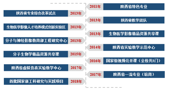 近年来,学院高度重视本科生教育教学质量,在实验室建设和课程创新改革等方面取得突出成果。生物医学工程专业2013年入选陕西省“专业综合改革试点”项目、2017年入选陕西省一流专业培育项目,生物医学工程专业教学团队获批为省级教学团队。学院现有教育部工程研究中心、生物医学影像省级人才培养模式创新实验区、省级高校实验教学示范中心和省级虚拟仿真实验教学中心等多个省部级教学和科研平台;获批国家级一流课程1门、国家级视频公开课1门,省级一流课程2门、省级精品资源共享课程2门,“国家级新工科研究与实践项目1项,校教学成果二等奖3项。