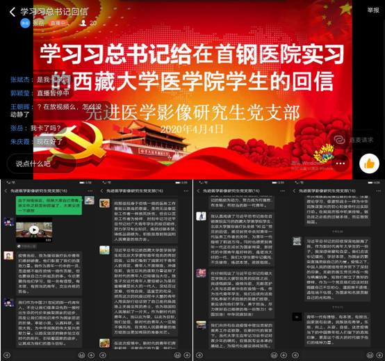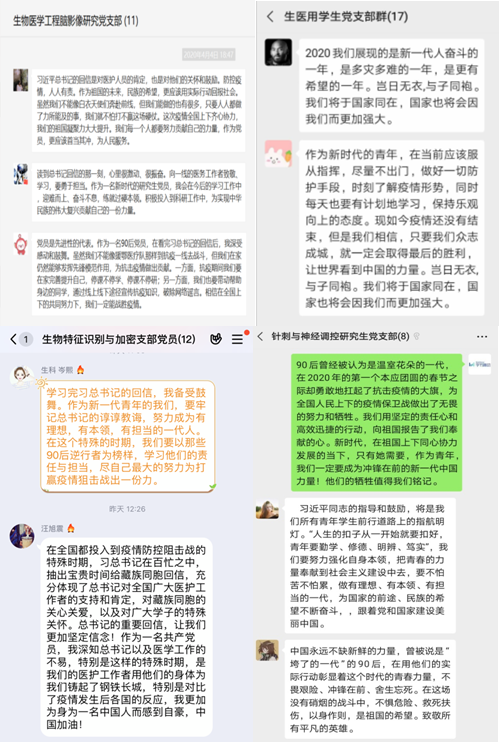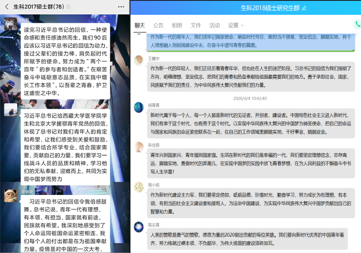 两封回信温暖亲切、语重心长、催人奋进。生科院全体研究生依托班级和党支部认真学习了回信内容,备受鼓舞,并开展了多形式、深层次的线上学习讨论活动,纷纷表示作为生物医学工程专业的研究生,要认真学习贯彻习近平总书记回信精神,刻苦钻研,充分发挥专业优势,不惧风雨、勇挑重担,用自己力所能及的形式,让青春在党和人民最需要的地方绽放绚丽之花。