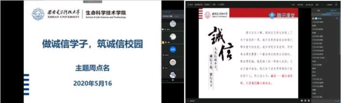 5月16日,辅导员高鹏通过腾讯会议平台为16、18级本科生开展了了以“做诚信学子,筑诚信校园”为主题的周点名活动,特别强调了疫情期间如实填报真实体温的重要性,并为同学们普及了校园贷的相关知识,希望同学们提高警惕,使同学们意识到生活、学习、做人中诚信的重要性。讲解结束后,同学们积极提出生活中的问题,交流讨论。