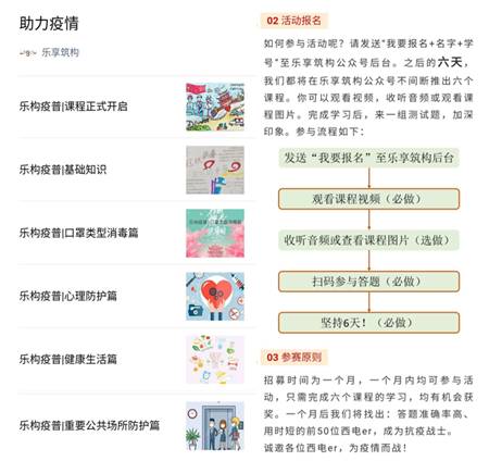 本次“乐构疫普”系列依次推出了五门课程,为疫情助力。分别为:新冠基础知识讲解、口罩及日常消毒注意事项、心理防护、健康生活系列以及重要公共场所防护。课程有视频、音频、PPT和文档四种学习方式可供选择。同时,为了使大家能够深刻地了解相关知识,激发大家的参与热情,课程附加了测试题以加深记忆。五门课程目前已经全部发送在了网络,具体链接置于文末。