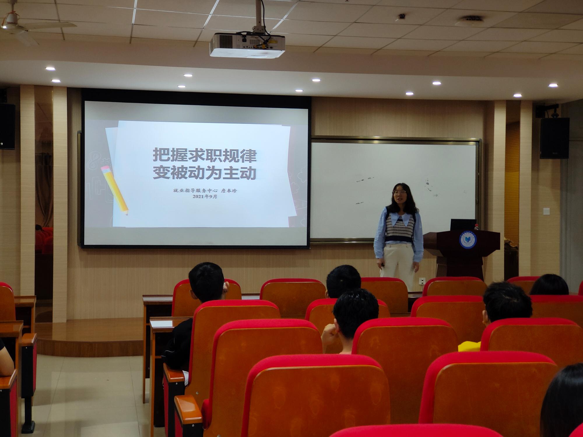 自党史学习教育开展以来,万象城坚持把“我为群众办实事”作为党史学习教育的出发点和落脚点,本着“把好事办实、把实事办好、办到师生心坎上”的原则, 2021年9月24日下午,万象城举办了“把握求职规律,变被动为主动”的求职攻略讲座,着力营造有利于学生就业的良好氛围,同时帮助学生全面了解当前全球新一轮科技革命和产业变革背景下,就业形势的多样化以及复杂化,助力学生高质量就业。此次讲座由学校本科生院研究生就业办公室主任詹奉珍老师主讲,学院党委副书记崔传贞、辅导员郭瑞、2018级本科生和2019级研究生参加了此次会议。