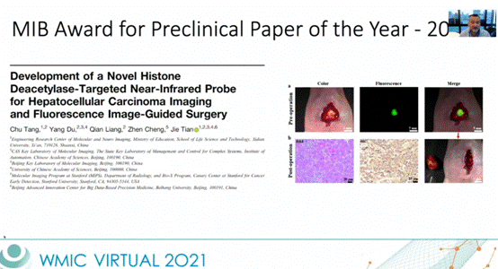 近日,awc777万象城娱乐官网青年教师唐初副教授最新研究成果“Development of a Novel Histone Deacetylase-Targeted Near-Infrared Probe for Hepatocellular Carcinoma Imaging and Fluorescence Image-Guided Surgery”,被世界分子影像大会 (WMIC)授予为2020年度预临床研究最佳论文奖(MIB Award for Preclinical Paper of the Year-2020)。作为国际分子影像学领域最具影响力的顶级学术盛会,WMIC每年都会吸引数千名来自世界各地的科学家和临床医生相聚一堂,分享探讨分子影像学的最新进展、创新理念和前沿研究。该论文获奖表明学校在分子影像领域的研究获得了国际同行专家的认可,这也是学校成果首次获得该奖。
