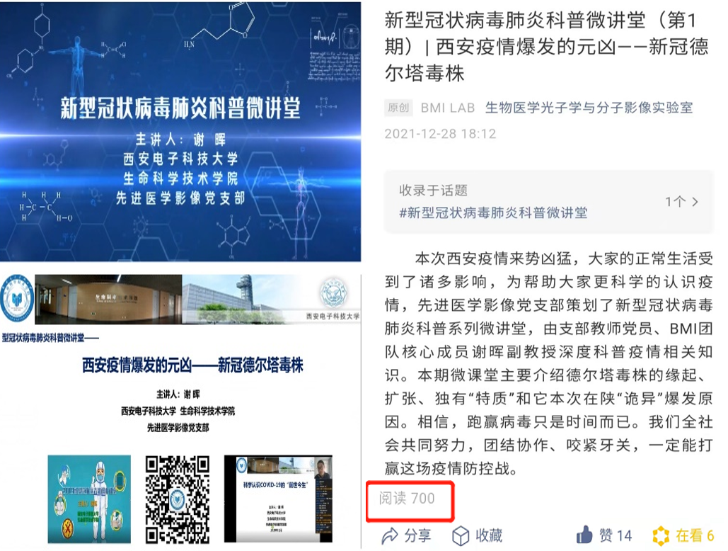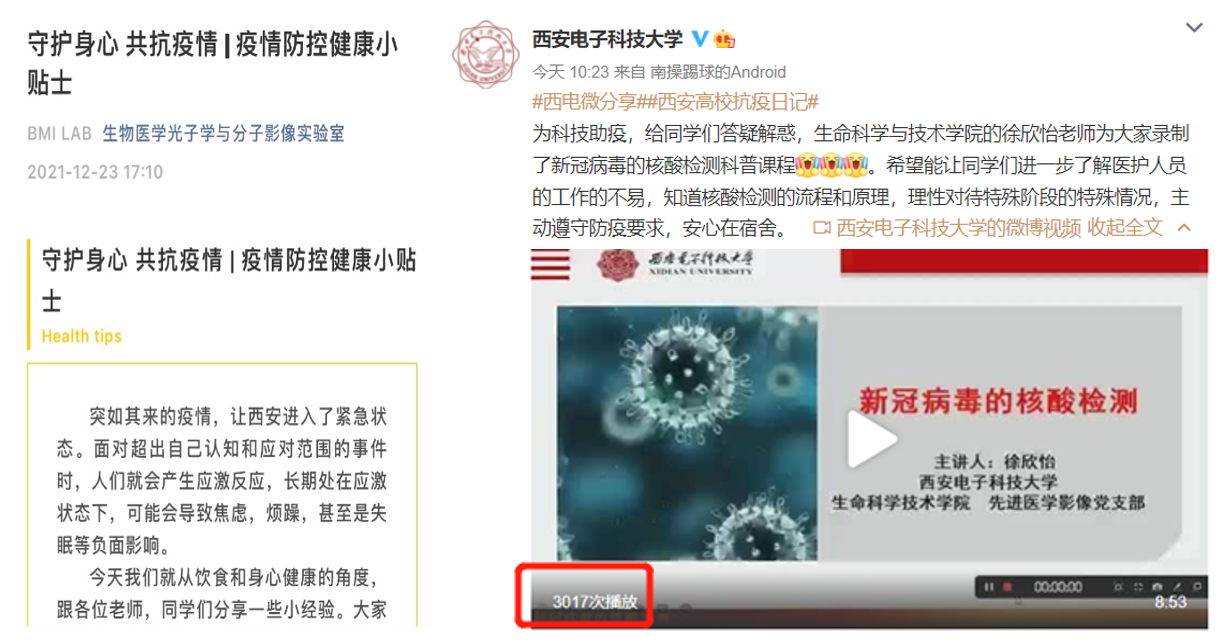 疫情期间,为帮助大家增强身体免疫力,抵抗病毒的侵袭,先进医学影像团队曾琦副教授发布疫情防控健康小贴士,从饮食和身心健康的角度跟老师和同学们分享经验,提醒大家克服心理问题,合理安排每日膳食,保证营养元素的摄入。为帮助大家更科学的认识疫情,先进医学影像党支部策划新冠肺炎科普讲堂,教师党员谢晖副教授录制新型冠状病毒肺炎科普系列微讲堂,深度科普疫情相关知识,发布当晚,首期介绍德尔塔毒株微讲堂阅读量突破七百;教师党员徐欣怡副教授录制新冠病毒的核酸检测视频,介绍核酸检测的流程和原理,被学校官方转发,六小时的微博播放量突破三千。先进医学影像党支部将继续发挥学科优势,医工结合,力克疫情!