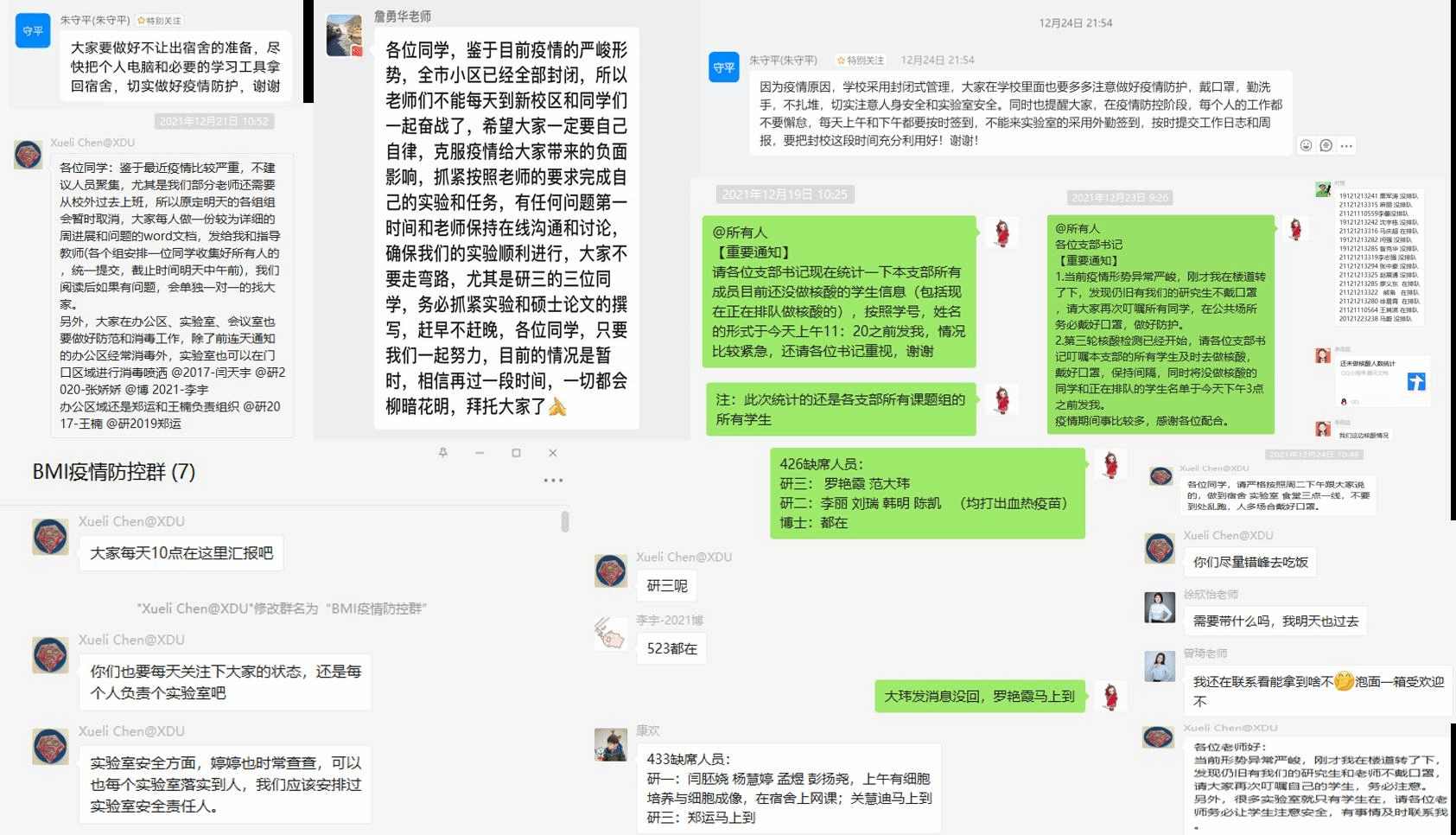 疫情初显之时,先进医学影像教师党支部各责任老师高度重视,及时响应,有序部署课题组相关工作。12月27日晚,先进医学影像党支部书记陈雪利同志线上召开团队疫情防控会,特别嘱咐大家三点:一要提高政治站位,服从安排;二要以身作则,积极参加抗疫服务工作;三要坚定信念,不信谣,不传谣,不恐慌,不添乱。另外,教师要时刻关注学生状态,加强师生沟通;严格执行学校各项安排,做好线上教学等相关工作;学生方面要做好自身防护,服从学校以及学院各项工作安排,按要求戴口罩、填报“晨午检”、参加核酸检测等工作;学生志愿者参加防疫工作一定要注意自身安全;党员同志积极发挥先锋模范作用,确保疫情防控各项工作有序进行。