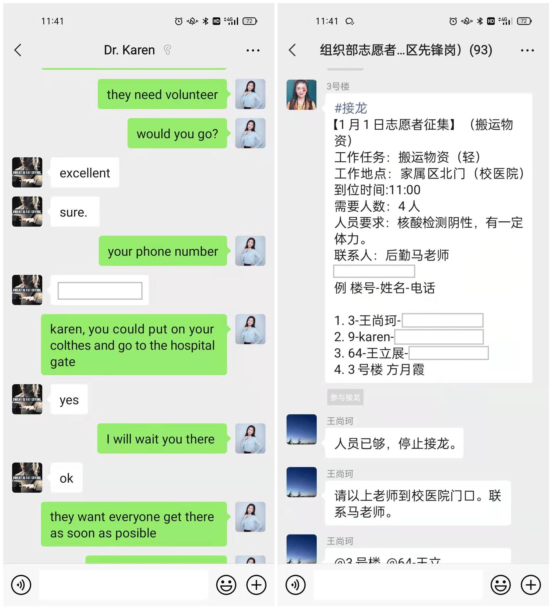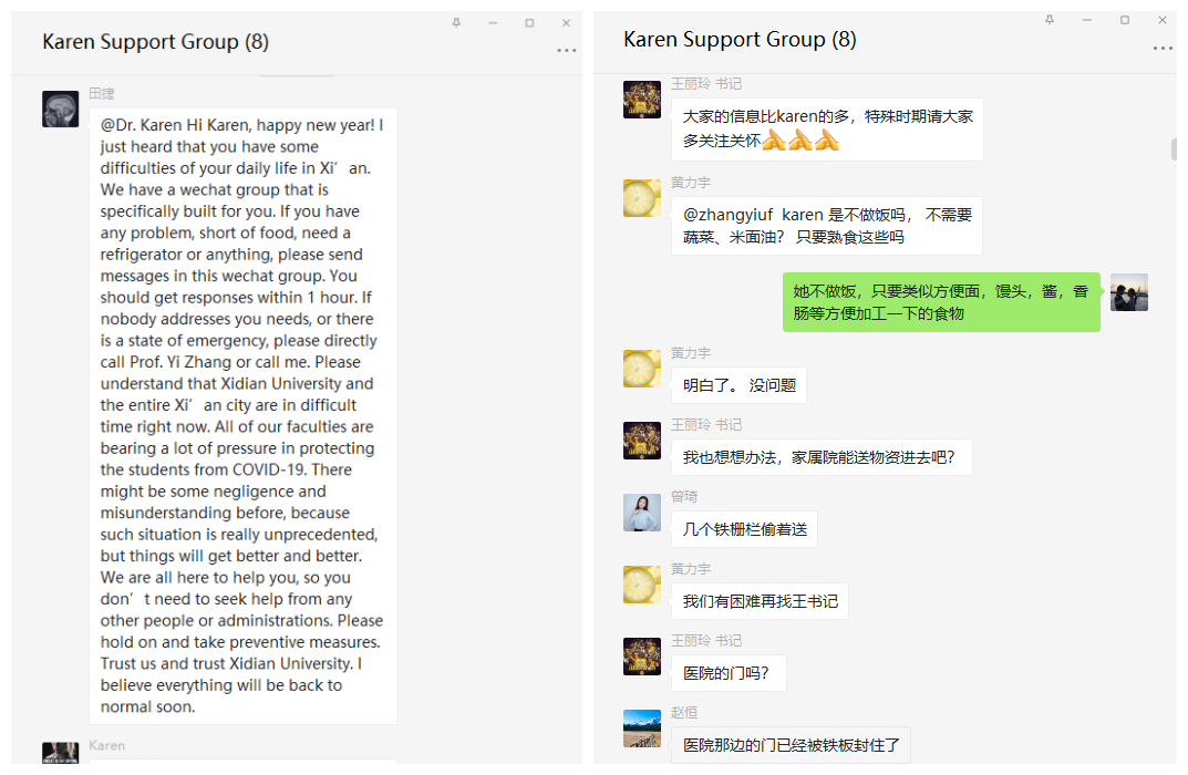 Karen居住在北校区家属区,平时多在教工食堂用餐,家中没有储备米、面、油等生活必需品。在家属区进行封闭式管理后,Karen的一日三餐遇到了很大的麻烦。在得知Karen生活上面临困难后,学院在院长田捷和党委书记王丽玲的带领下,成立了以王丽玲书记统领,以住在北校区家属院的黄力宇、赵恒、曾琦、穆俊娅、张毅老师为主的帮扶工作组,建立了“Karen Support Group”微信工作群。