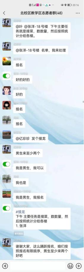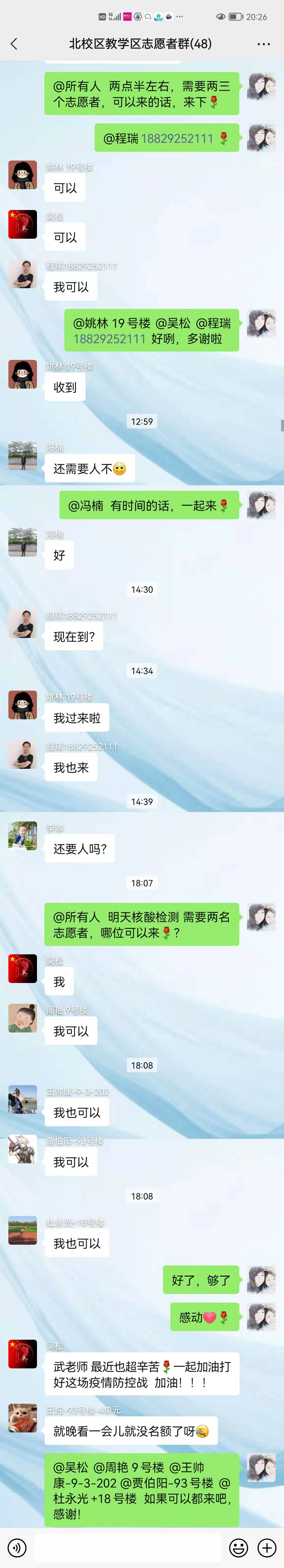 同时,防控小组积极招募志愿者。及时成立志愿者工作组和工作微信群,有工作任务及时在群内发布,党员干部和研究生入党积极分子经常立刻回应,形成了核酸检测志愿者团队、订取餐服务志愿者团队和物资供应志愿者团队,涌现出一批政治坚定、积极热情、吃苦耐劳和乐于奉献的稳定的志愿者,保障抗疫的各项任务及时高效地完成。