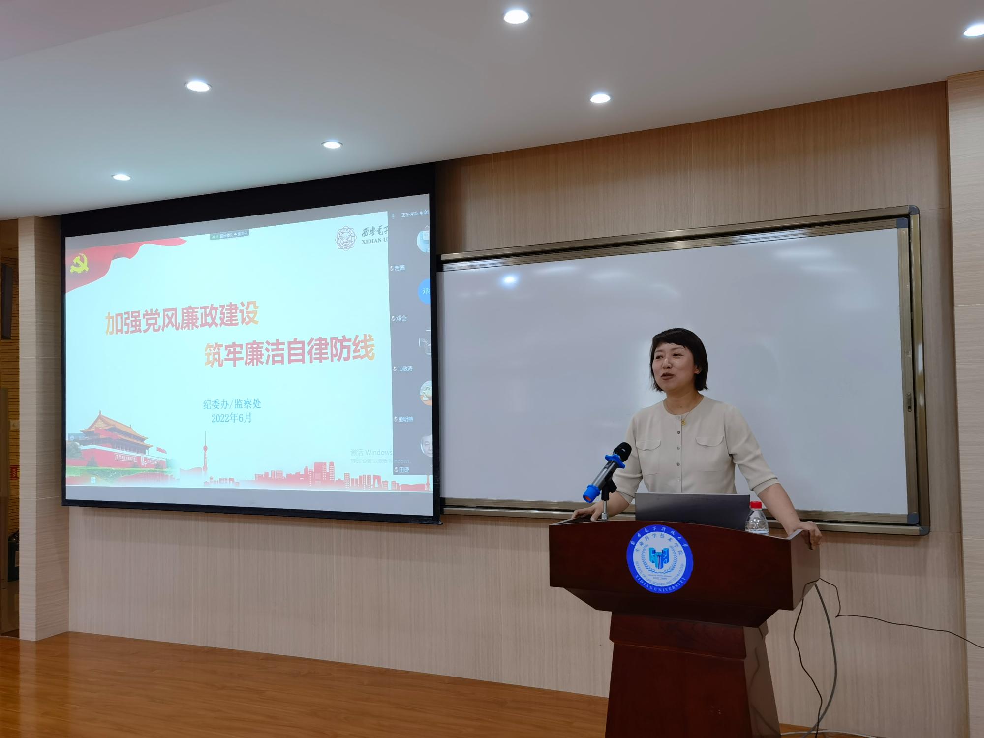 此次培训以“加强党风廉政建设,筑牢廉洁自律防线”为主题。靳珠从解读党的十九大以来全面从严治党新部署新要求入手,带领学院教职工深入学习领会了习近平总书记关于全面从严治党的重要论述及十九届中央纪委六次全会精神和2022年教育系统全面从严治党工作视频会精神。结合党的十八大以来违纪违法案例、师德师风失范行为典型案例的深刻教训和启示,靳珠进一步向学院教职工明确了“知敬畏、存戒惧、守底线”的要求。她指出,作为高校教师,要带头遵守党章党规党纪,带头严明政治纪律和政治规矩,始终保持清正廉洁的政治本色,筑牢拒腐防变的思想防线,营造风清气正、干事创业的良好氛围。
