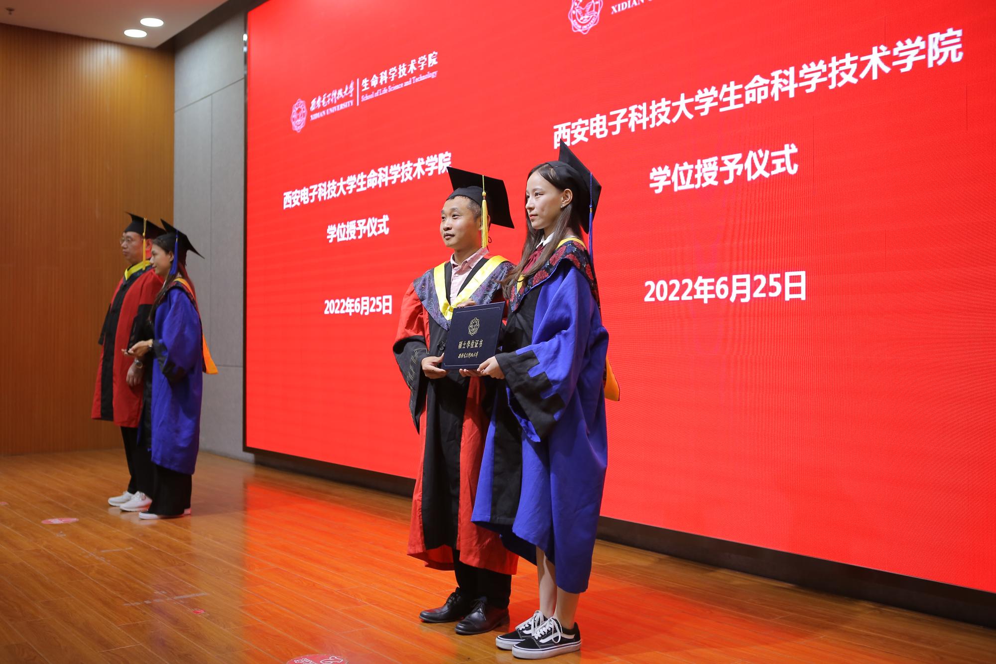 朱守平、秦伟为2022届毕业生逐一颁发学位证书、行拨穗礼,并合影留念。