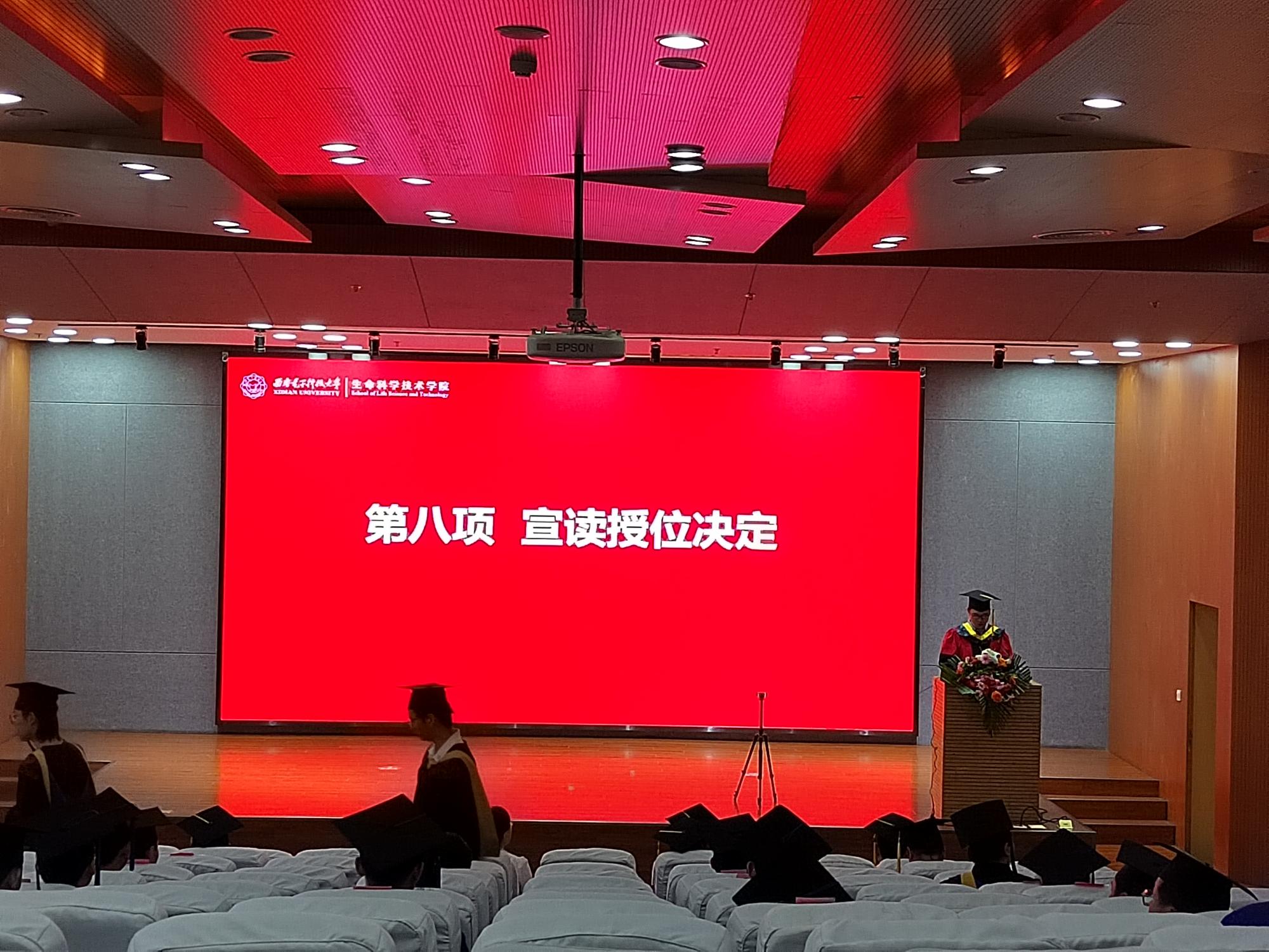 张敏代表硕士毕业生发言,她回顾了研究生期间校园生活点滴,表达了对学校、学院的依依惜别之情,希望大家都能够成为有理想、有担当、有使命感的医工交叉复合型人才,在祖国最需要的地方建功立业,开启新的人生篇章。让红色电波永不消逝,西电精神永久传承!
