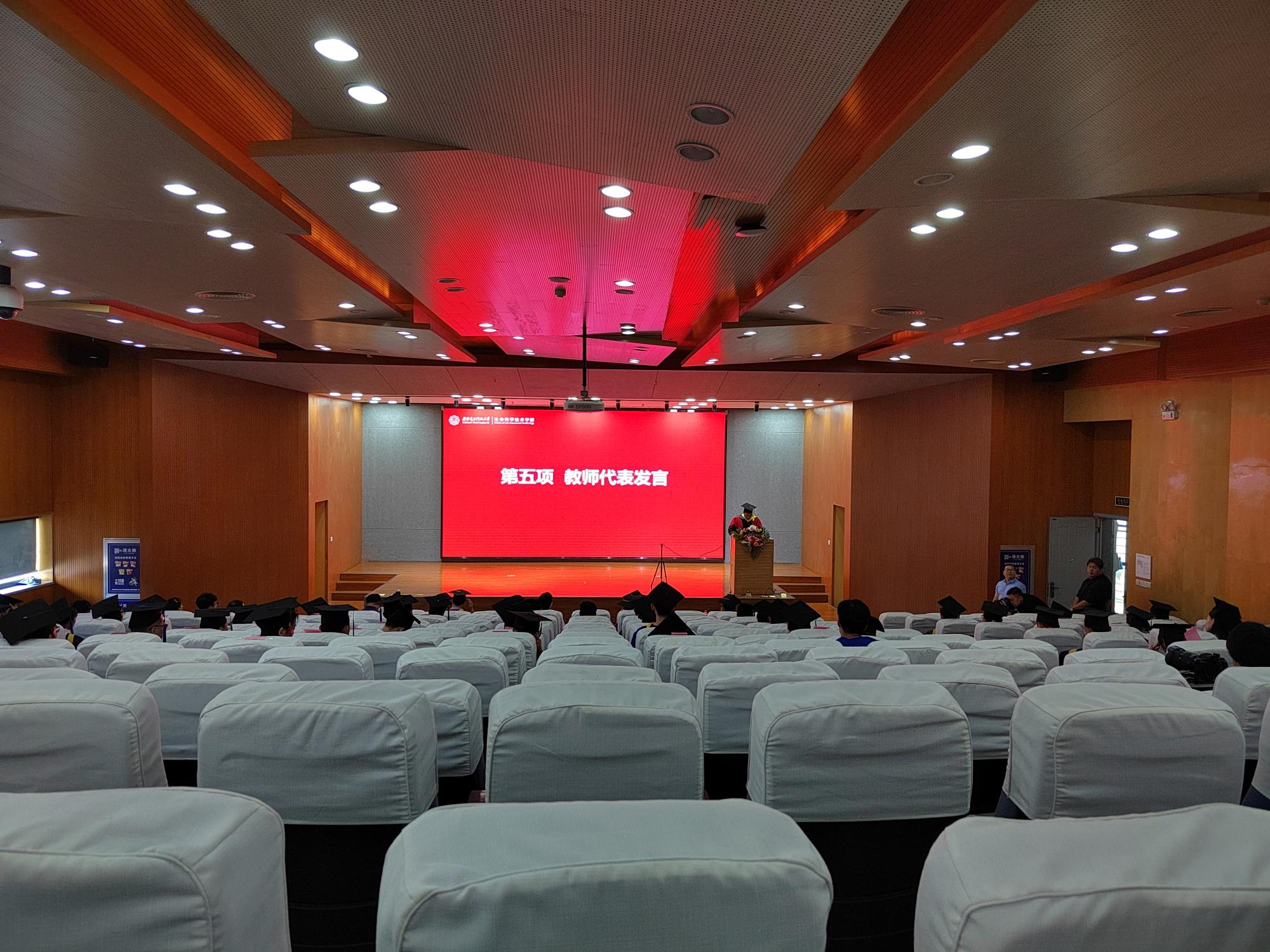 教师代表詹勇华对顺利完成学业的毕业生们表达了衷心的祝贺和对未来的期盼,希望大家目标远大,以开放的胸襟和旺盛的进取心,拥抱新的挑战,不断学习,不断修炼,提升我们的人生和专业,飞翔到新的高度。
