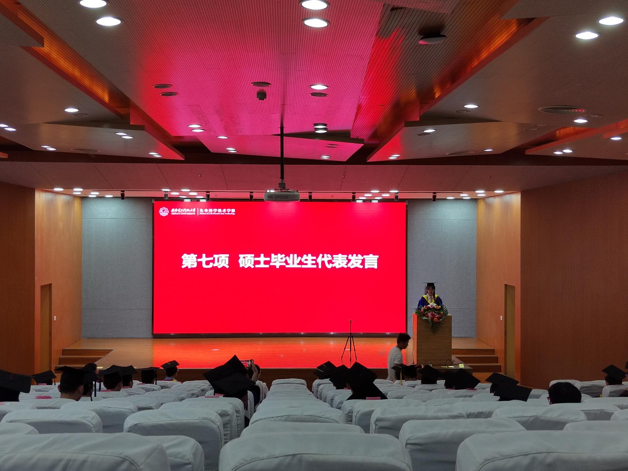 在庄严雄壮的国歌声中,毕业典礼正式开始。田捷代表学院向所有的毕业生致以热烈的祝贺。在此临别之际,田捷寄语所有毕业生,要拥抱未来的不确定性,不拘泥于眼前,胸怀远大格局,勇往直前,抓住生命科学这个二十一世纪最活跃、发展最迅速、影响最广泛、创新性极强的学科领域,在青春的赛道上奋力跑出新时代青年的最好成绩。