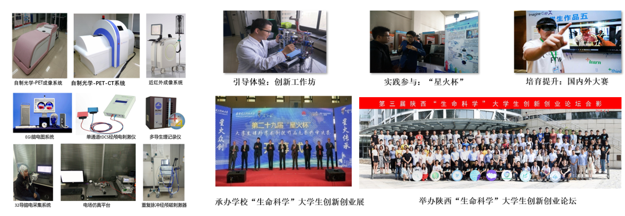学院立足学科特色和行业优势,积极探索大学生创新创业实践教育,构建了项目制、导师制和校企联合培养三级体系,打造以竞赛为驱动的双创实践活动平台,培育本科生创新创业项目;依托分子与神经影像教育部工程研究中心,开展全方位的校企合作,推动研究成果应用转化,拓展人才培养模式;通过学生奖学金评定等政策发挥实践能力培养的指挥棒作用,加强对学生创新素养的认可,逐步形成了崇尚创新、勇于实践的良好氛围。学院先后建成2个大学生创新创业基地、形成了3个示范性创新创业团队,组织发起3届陕西“生命科学”大学生创新创业论坛,并在2017年承办了全校星火杯大赛。近五年来,学院本科生共获“挑战杯”大学生创业计划大赛金奖、中国国际“互联网+”大学生创新创业大赛银奖、全国大学生生物医学工程创新设计竞赛一等奖、全国大学生FPGA创新设计竞赛二等奖等省部级以上竞赛奖励47项。