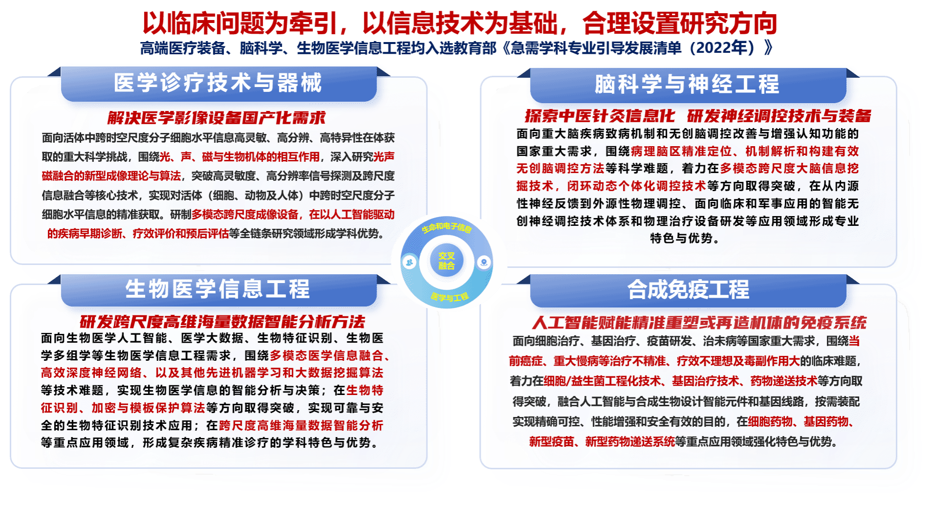 awc777万象城娱乐官网作为医工交叉融合的重要载体,面向人民生命健康和国家重大需求,依托学校雄厚的电子信息优势,聚焦生物医学工程一级学科博士学位点建设,探索生命健康与电子信息深度融合前沿领域,经过三十余年的发展积淀,形成了医学诊疗技术与器械、脑科学与神经工程、生物医学信息工程、合成免疫工程等前沿和特色学科方向,在师资队伍建设、科研成果产出、人才培养成效、社会服务效果等方面成绩斐然,临床医学学科进入并保持在ESI全球前1%。