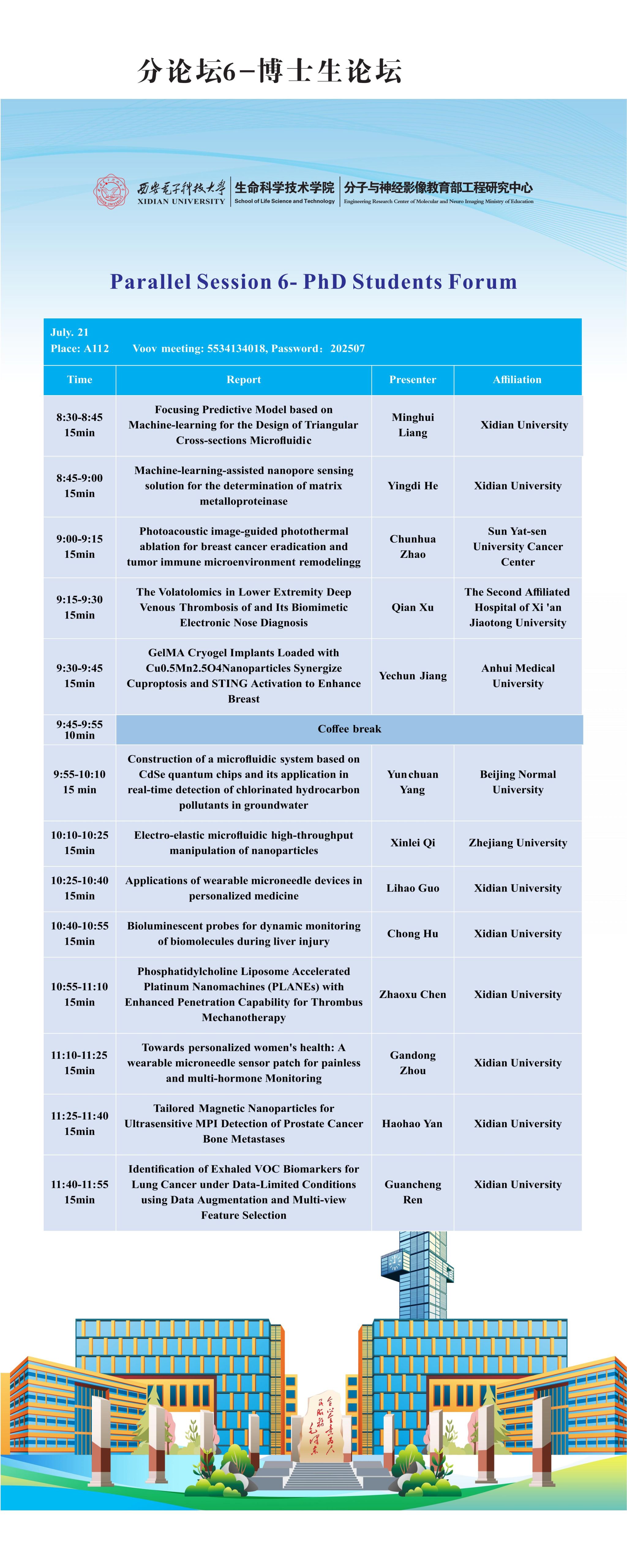 Parallel Session 1- Biomedical Engineering II | A112 腾讯会议号:5534134018 密码:202507 | July. 19 Afternoon and July. 20 All day |