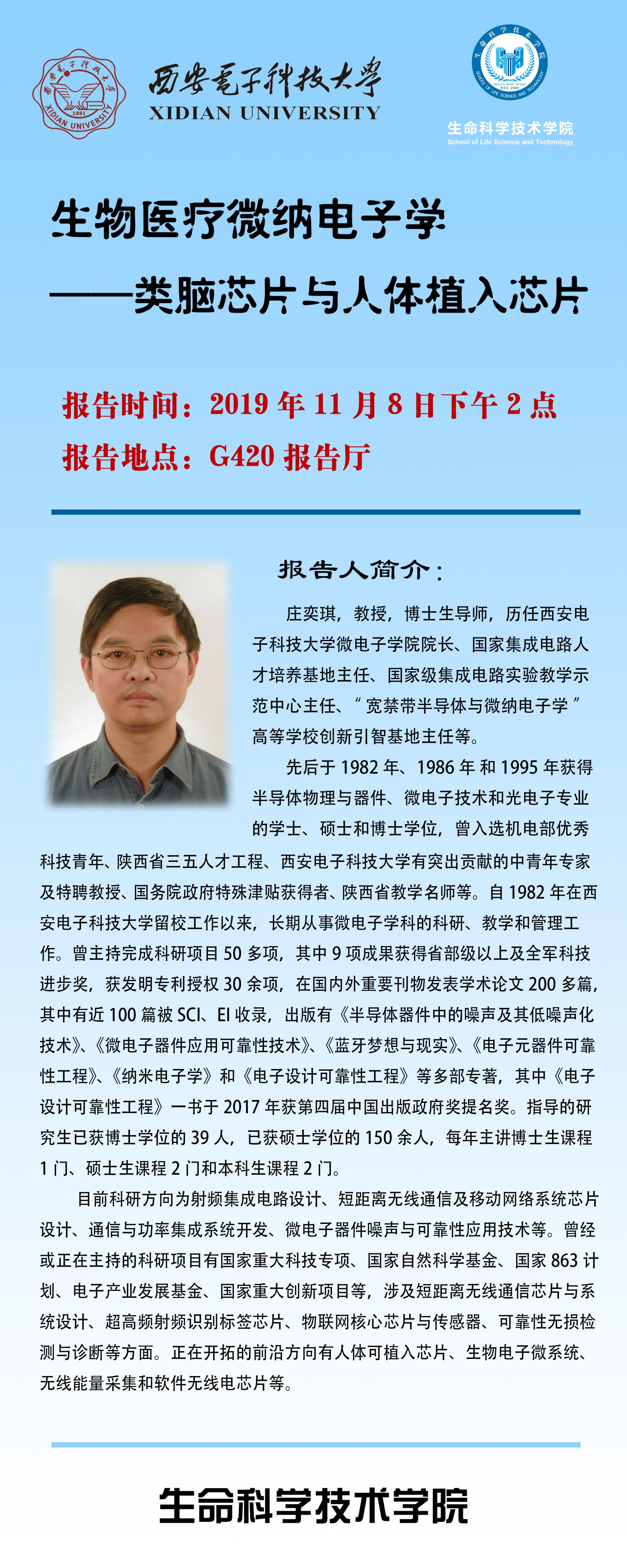 在过去半个世纪内,以集成电路为代表的微纳电子技术在很大程度上改变了世界的面貌,如今其应用领域正在从“计算机、通信、信息处理”转向“健康、能源、环保”这三大更具生命力与发展空间的崭新领域。庄奕琪教授最新撰写的《生物医疗微纳电子技术》介绍了与人类健康息息相关的生物医疗领域中微纳电子技术的最新发展与应用,获2019年国家出版基金资助。本讲座主要讲述类脑芯片和人体植入芯片近五年的研究进展和应用实例。类脑芯片是模仿人体神经系统的结构原理和运行机制,用微纳电子电路来再造人工智能系统,以便实现甚至超越真实人脑的智慧。人体植入芯片则是将微纳集成芯片植入大脑、脏器、骨骼和肌肉等人体器官,实现人体机能的监测、治疗、给药、康复甚至部分器官的替代,为人类健康带来福音。