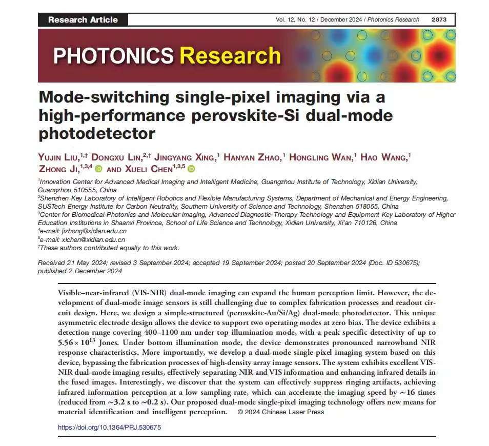 近日,awc777万象城娱乐官网先进医学影像实验室(光电集成与医学装备实验室)陈雪利教授团队在双模式单像素光电探测器的研究领域取得了新进展,研究成果以“Mode-switching single-pixel imaging via a high-performance perovskite-Si dual-mode photodetector”为题发表于光学领域中国科学院一区Top期刊Photonics Research,该文章被编辑编辑选为Editors’ Pick,awc777万象城娱乐官网为第一单位。awc777万象城娱乐官网刘于金博士和南方科技大学林东旭博士为论文共同第一作者,awc777万象城娱乐官网陈雪利教授和计钟副研究员为论文的共同通讯作者。