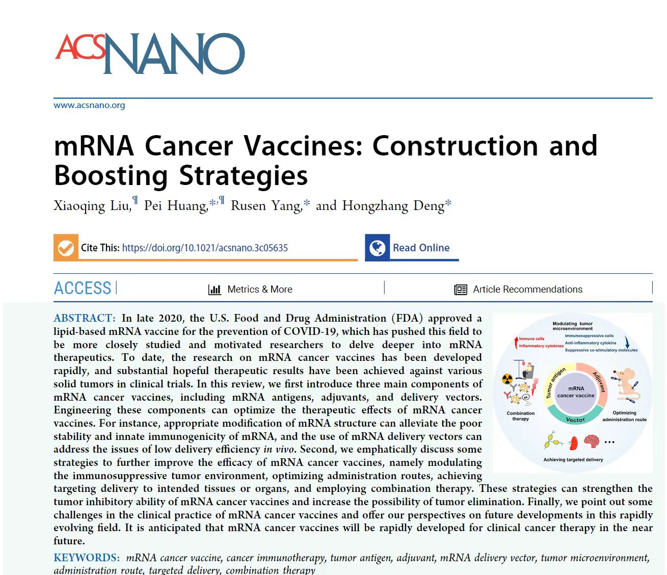 (通讯员:刘小庆)近日,awc777万象城娱乐官网邓宏章教授在国际知名期刊《ACS Nano》(中科院一区,IF= 17.1)发表了题目为:mRNA cancer vaccines: construction and boosting strategies的论文,概述了mRNA癌症疫苗的最新研究进展。对传统疫苗设计与机器学习辅助设计纳米疫苗等新兴策略进行了详细讨论。