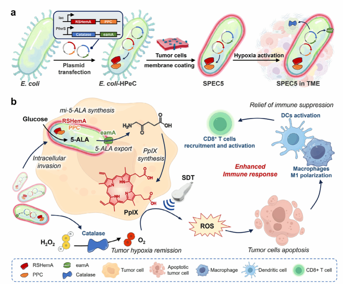 声动力疗法(SDT)是一种利用超声激活声敏剂选择性破坏肿瘤的非侵入性癌症治疗方法,相较光动力疗法具有更深的组织穿透力,可有效诱导免疫原性细胞死亡(ICD),激活抗肿瘤免疫反应。然而,SDT的临床应用受限于声敏剂的肿瘤特异性差和肿瘤内积累不足,导致疗效不佳和脱靶效应。王忠良团队设计了一种基于工程化益生菌的5-ALA供应系统(SPEC5),通过合成生物学优化大肠杆菌的5-ALA生物合成路径,并利用肿瘤细胞膜伪装增强肿瘤靶向性和免疫逃避。SPECS在肿瘤微环境(TME)中选择性定植,持续合成5-ALA,促进肿瘤细胞内PpIX原位生成,从而实现高效SDT并诱导抗肿瘤免疫反应。研究内容包括SPEC5的构建与优化、体外和体内SDT效果验证、肿瘤微环境免疫重塑机制探索,以及系统安全性和生物稳定性的评估,旨在为精准肿瘤治疗提供创新策略。这项研究为声动力治疗提供了一种新颖的肿瘤特异性声敏化剂供应策略,并有望革新基于5-ALA的肿瘤靶向SDT的范式。