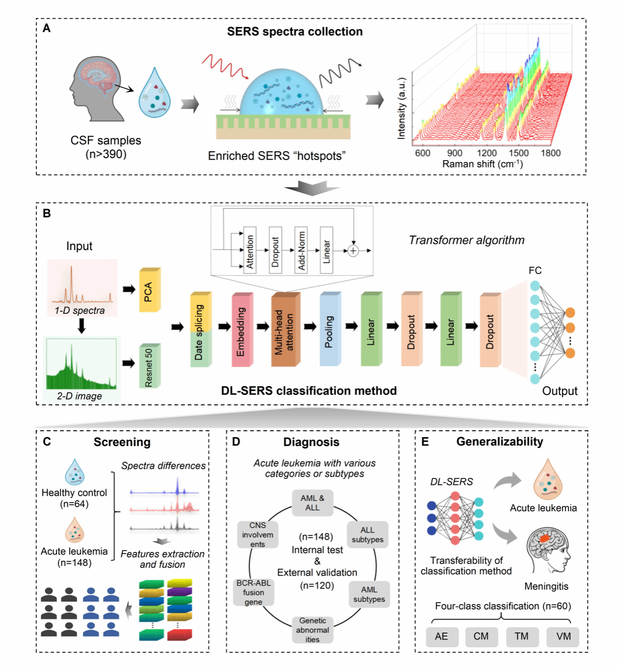 急性白血病发生中枢神经系统浸润称为中枢神经系统白血病(central Nervous System Leukemia, CNSL),常见于急性淋巴白血病(acute lymphoblastic leukemia, ALL)或者急性髓系白血病(acute myeloid leukemia, AML)中的M4及M5亚型,且儿童ALL并发CNSL概率远高于成人。目前,基于脑脊液(cerebrospinal fluid, CSF)的细胞学检测是CNSL的标准诊断方法,然而,由于白血病细胞CNS浸润过程中高度表达黏附分子使得细胞易粘附到脑膜血管内壁,导致CSF中异常细胞含量降低,常规细胞学或者流式细胞术方法检测敏感性无法满足实际临床需求,存在假阴性结果或者漏诊现象。因此,研究具有高灵敏度和特异性的急性白血病快速鉴别及分类方法具有重要临床应用价值。SERS光谱是一种分子指纹光谱技术,具有灵敏度高、特异性好、谱带窄、操作简单、样品需求少以及不受生物样品自发荧光和水干扰等优点,在液体活检及疾病检测领域受到广泛关注。人工智能AI促进了SERS技术的快速发展,包括在增强纳米材料设计、报告分子选择、光谱解析和处理等方面,尤其是AI-SERS结合策略在不同癌症的早期检测、疾病分类和诊断、以及治疗评估等领域引起广泛关注。