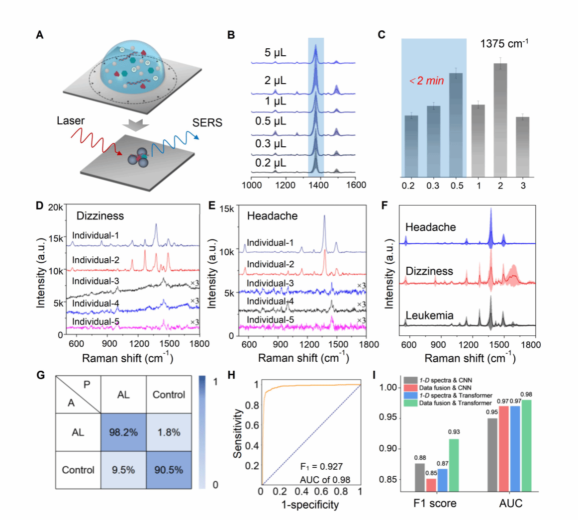 图2. 急性白血病筛查:(A)SERS检测示意图;(B-C)不同体积脑脊液的SERS光谱;(D-E)健康人群脑脊液SERS光谱;(F)急性白血病患者与健康人SERS光谱对比;(G)混淆矩阵;(H)ROC曲线;(I)不同分类方法性能对比。