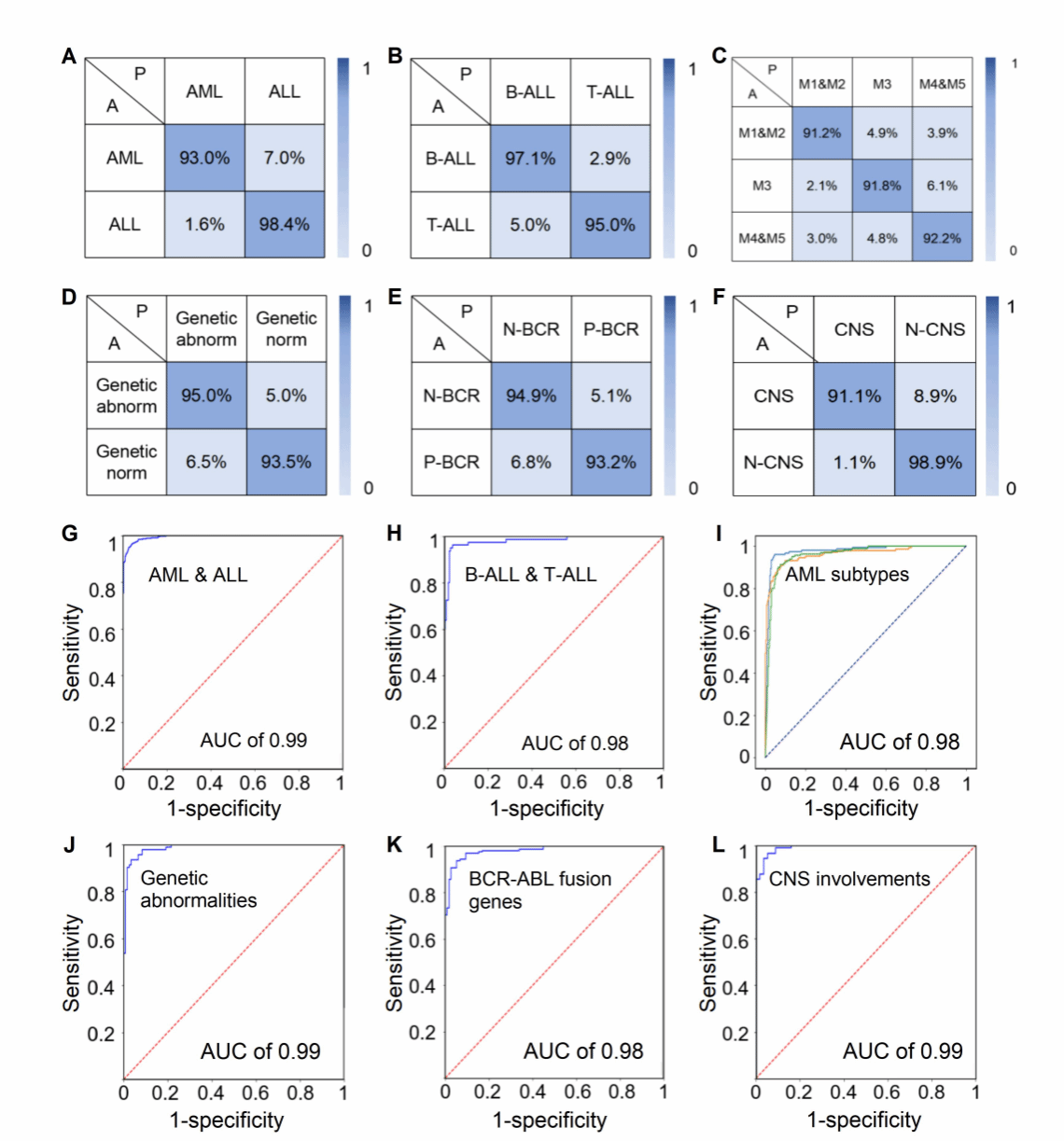 图3. 急性白血病诊断:(A-F)不同急性白血病分类混淆矩阵;(G-L)ROC曲线。